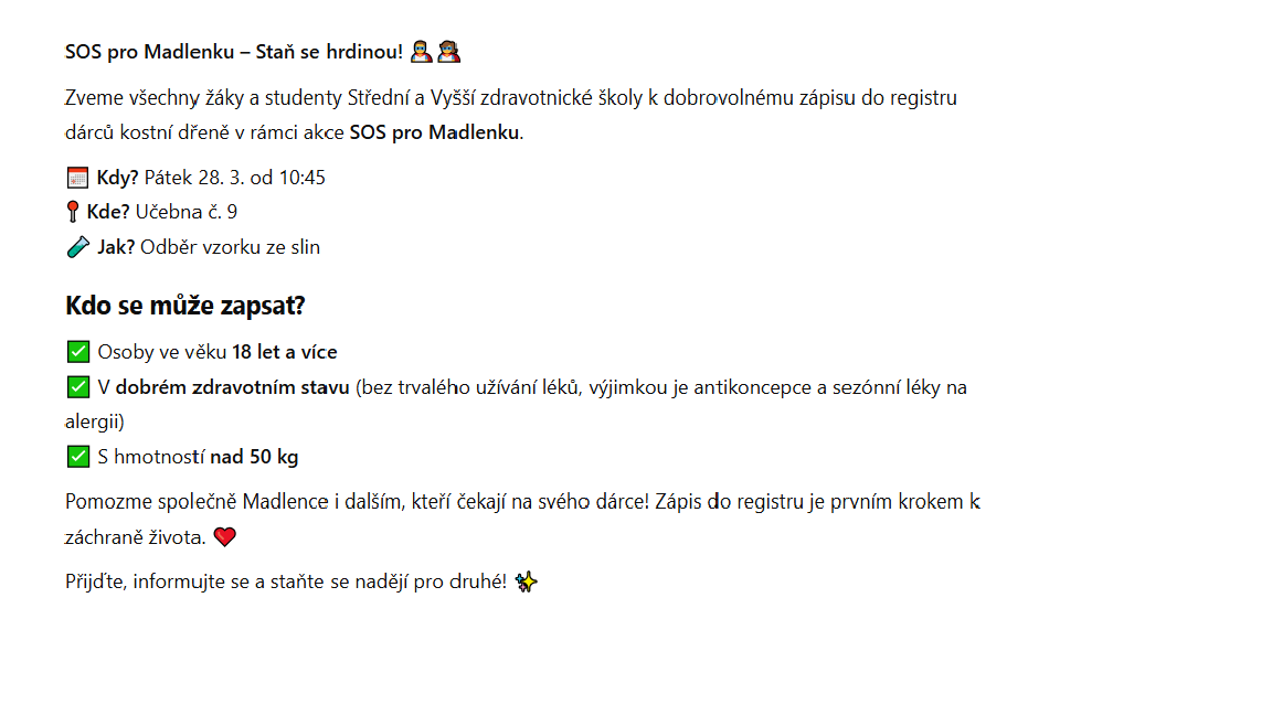 S hrdostí oznamujeme, že v rámci akce SOS pro Madlenku se do registru dárců kostní dřeně zapsalo 63 žáků a studentů z naší školy!