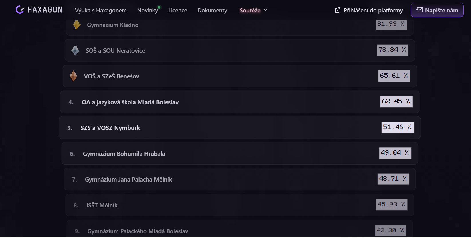 Naše škola byla úspěšně nominována na účast ve středočeské soutěži žáků středních škol v IT a kybernetické bezpečnosti HAXAGON Skirmish Střední Čechy 2025. Nominaci předcházelo 1. kolo krajské soutěže, ve kterém jsme obsadili 5. místo ze 40 zúčastněných.