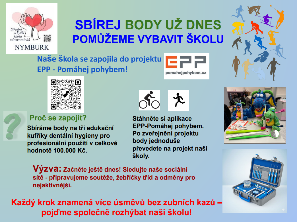 Naše škola se zapojila do projektu EPP – Pomáhej pohybem, díky kterému můžeme získat tři edukační kufříky dentální hygieny v hodnotě 100.000 Kč. Tyto pomůcky pomohou zkvalitnit výuku a přiblížit moderní postupy péče o ústní zdraví.