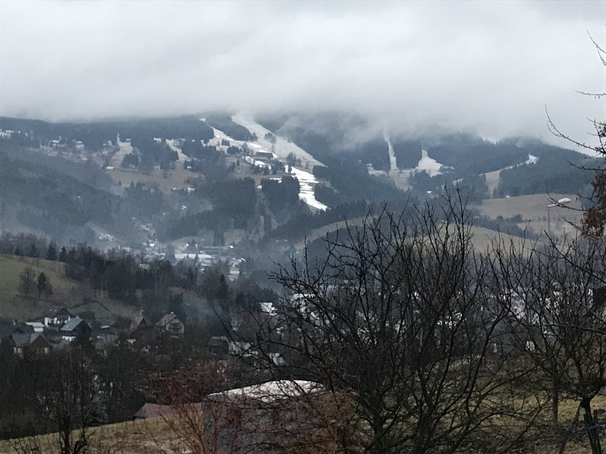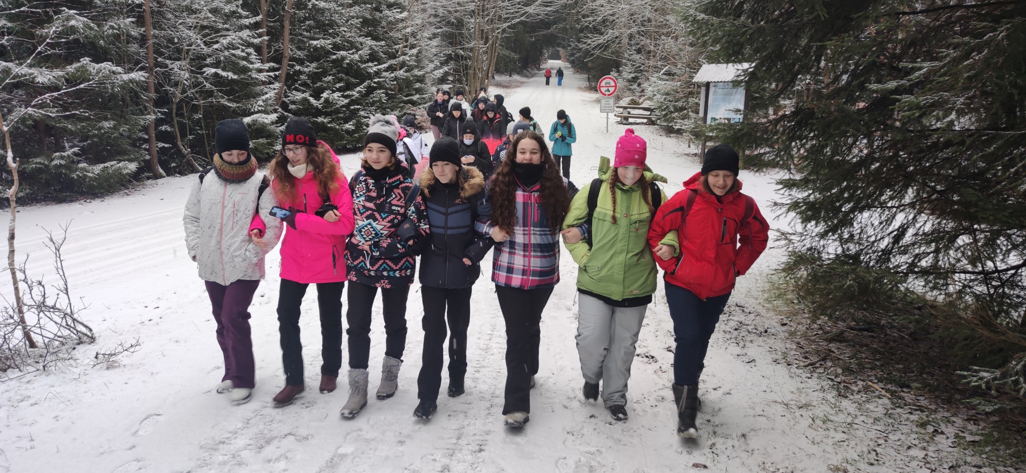 Lyžařský kurz 1. Z je v plném proudu. Bohužel Krakonoš prosby nevyslyšel, ale nás to nezlomí. V neděli jsme vyrazili přes Studenov, sjezdovkou nahoru, do Harrachova. Celkem jsme pokořili 14 km a zaslouženě se vrátili do chalupy autobusem.