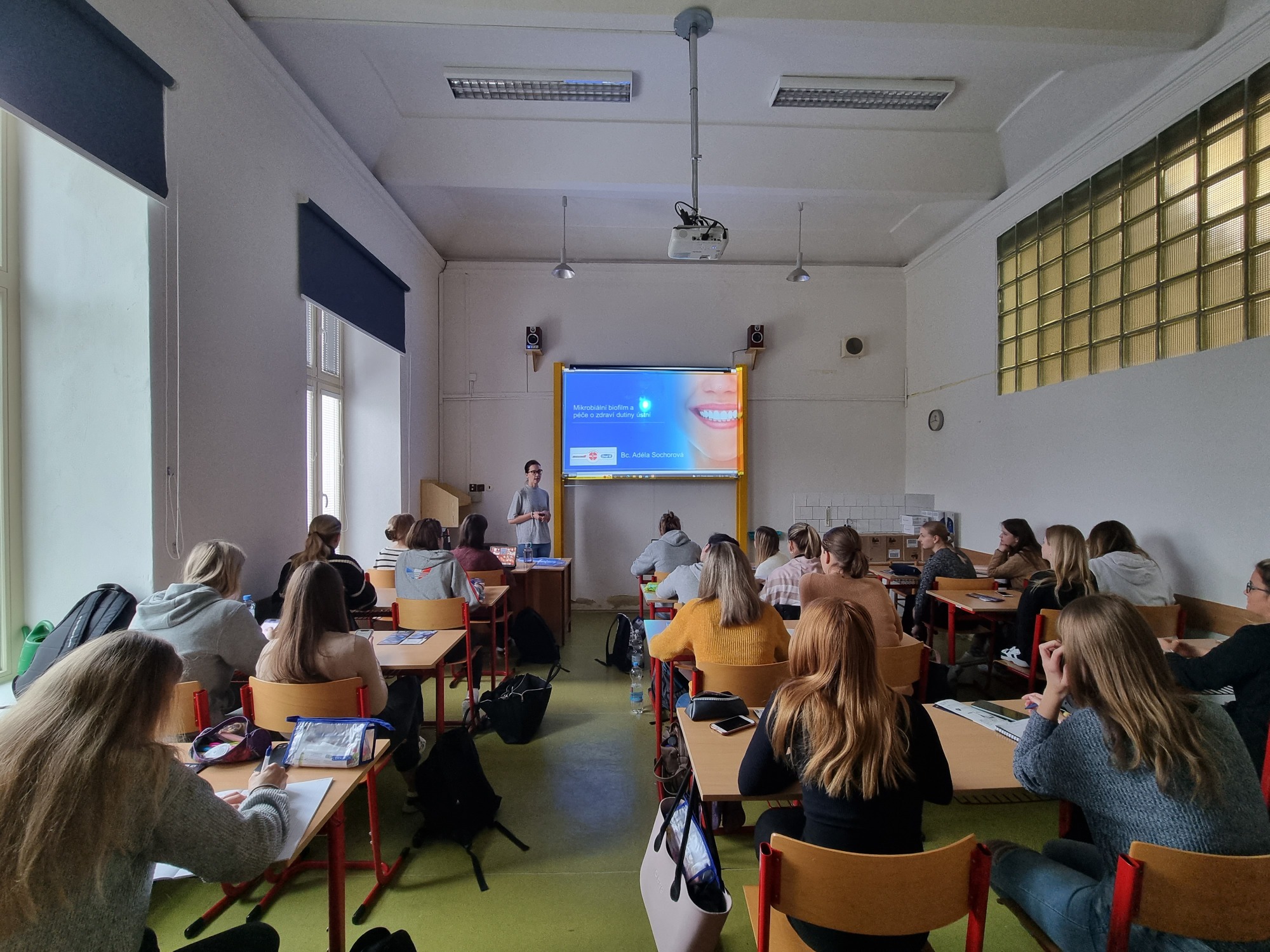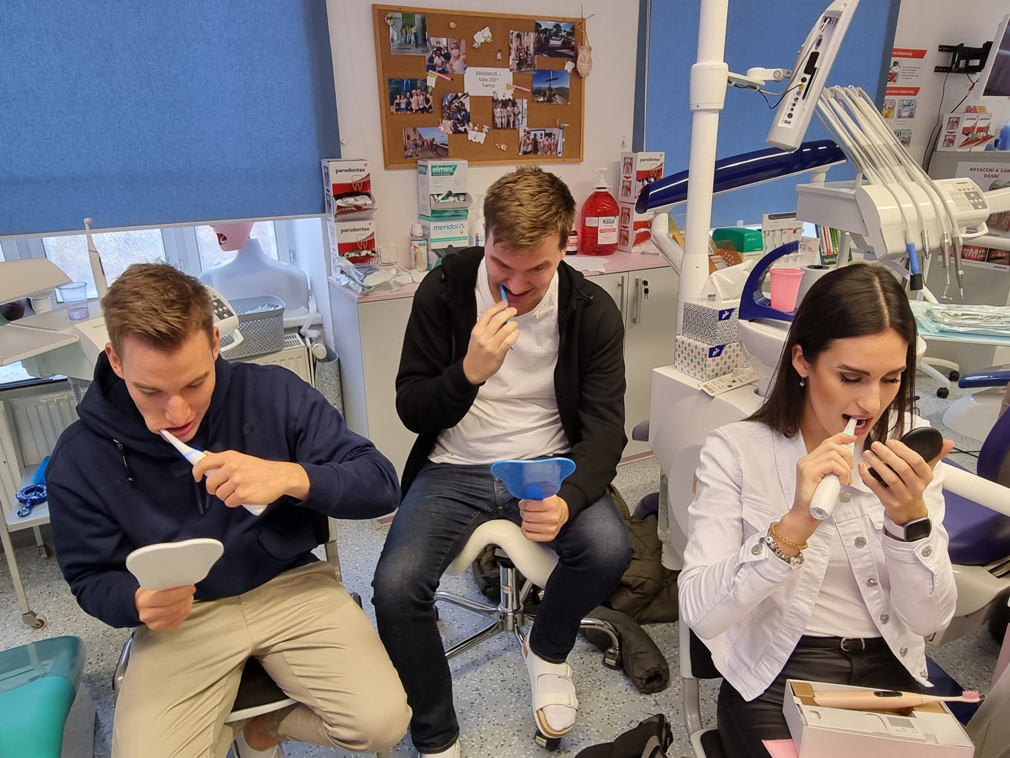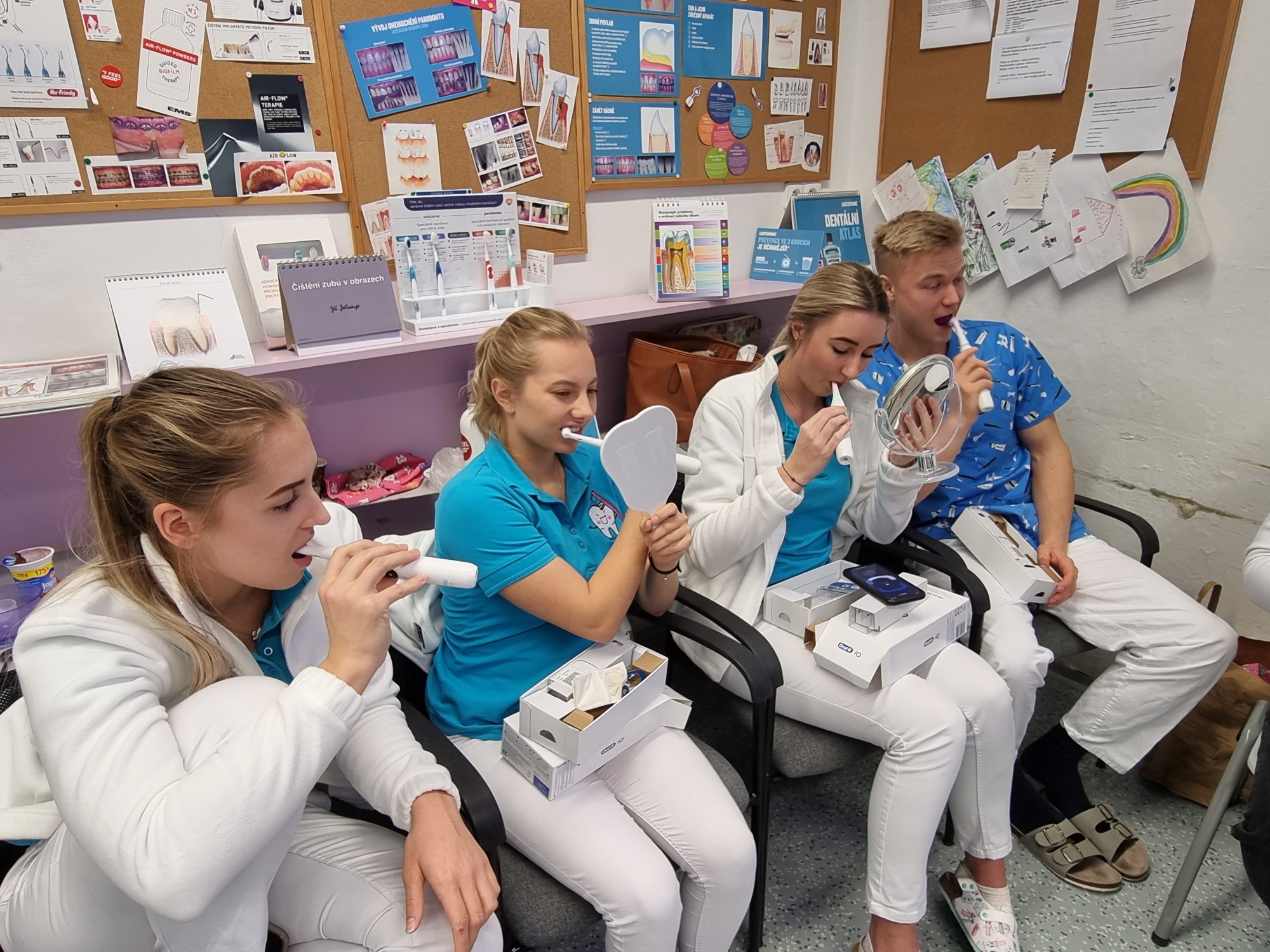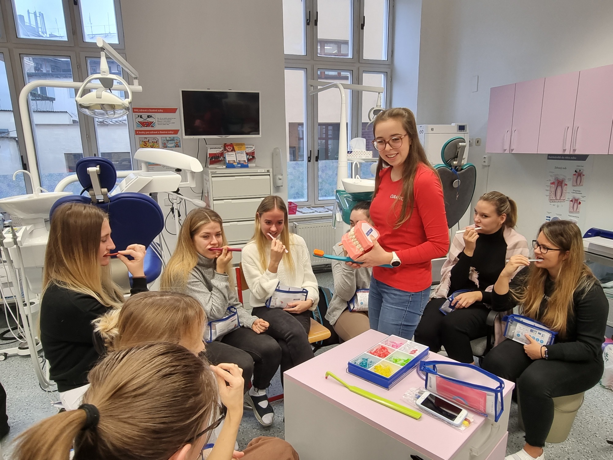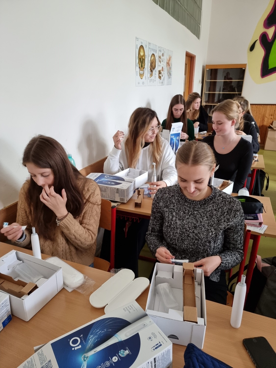 Dne 24. 11. 2022 proběhla u studentek 1.DH prezentace kartáčků pro děti a dospělé, mezizubní péče. Studentky se seznámily se speciálními pomůckami jako například solo kartáček, Hydrosonické kartáčky Curaprox a další. Po seznámení proběhl nácvik technik s kartáčky pod vedením studentek stomatologie. Do školní ordinace jsme obdrželi dar v podobě mezizubních kartáčků, ústní vody a tekutinu na vizualizaci plaku.