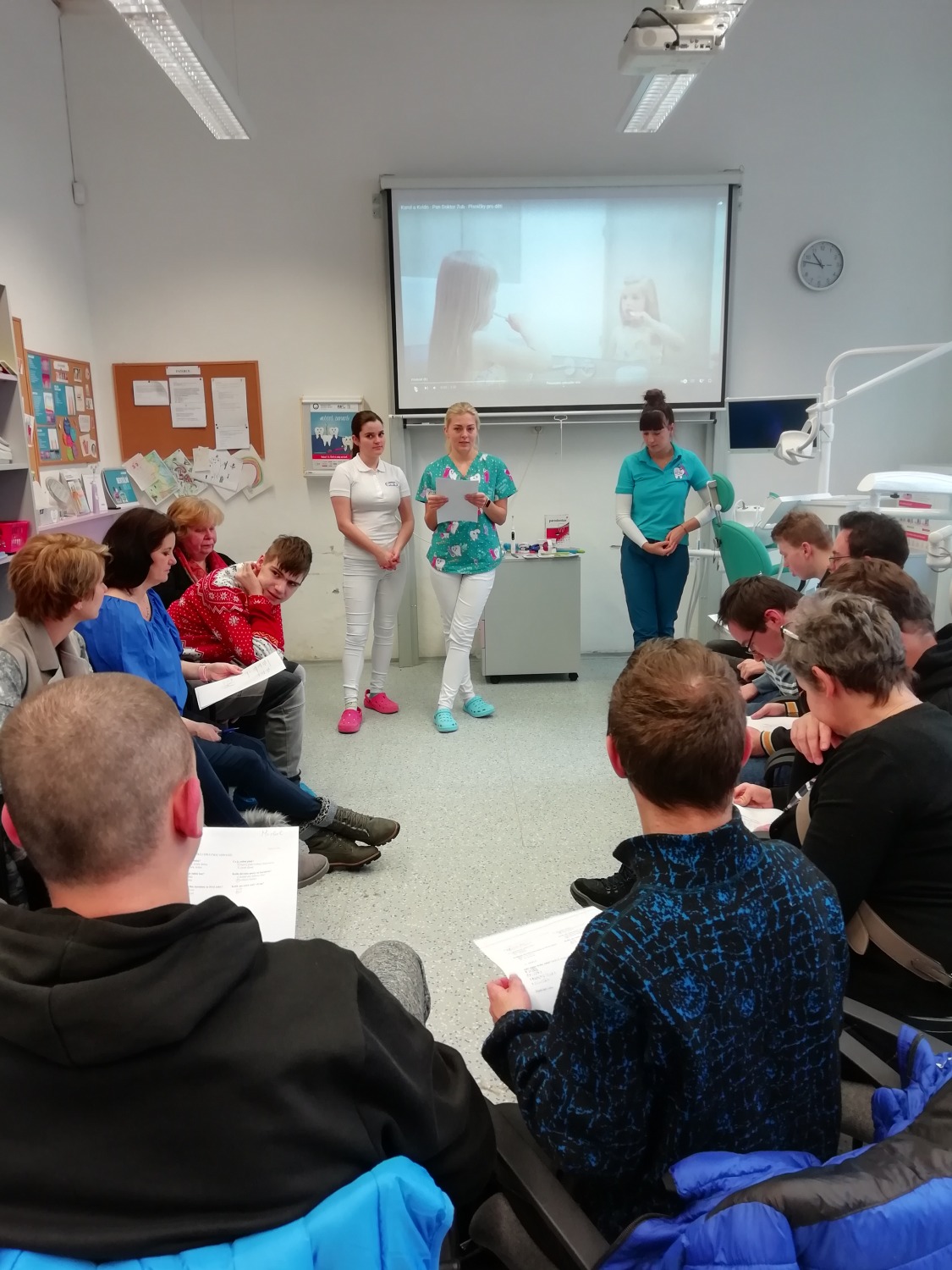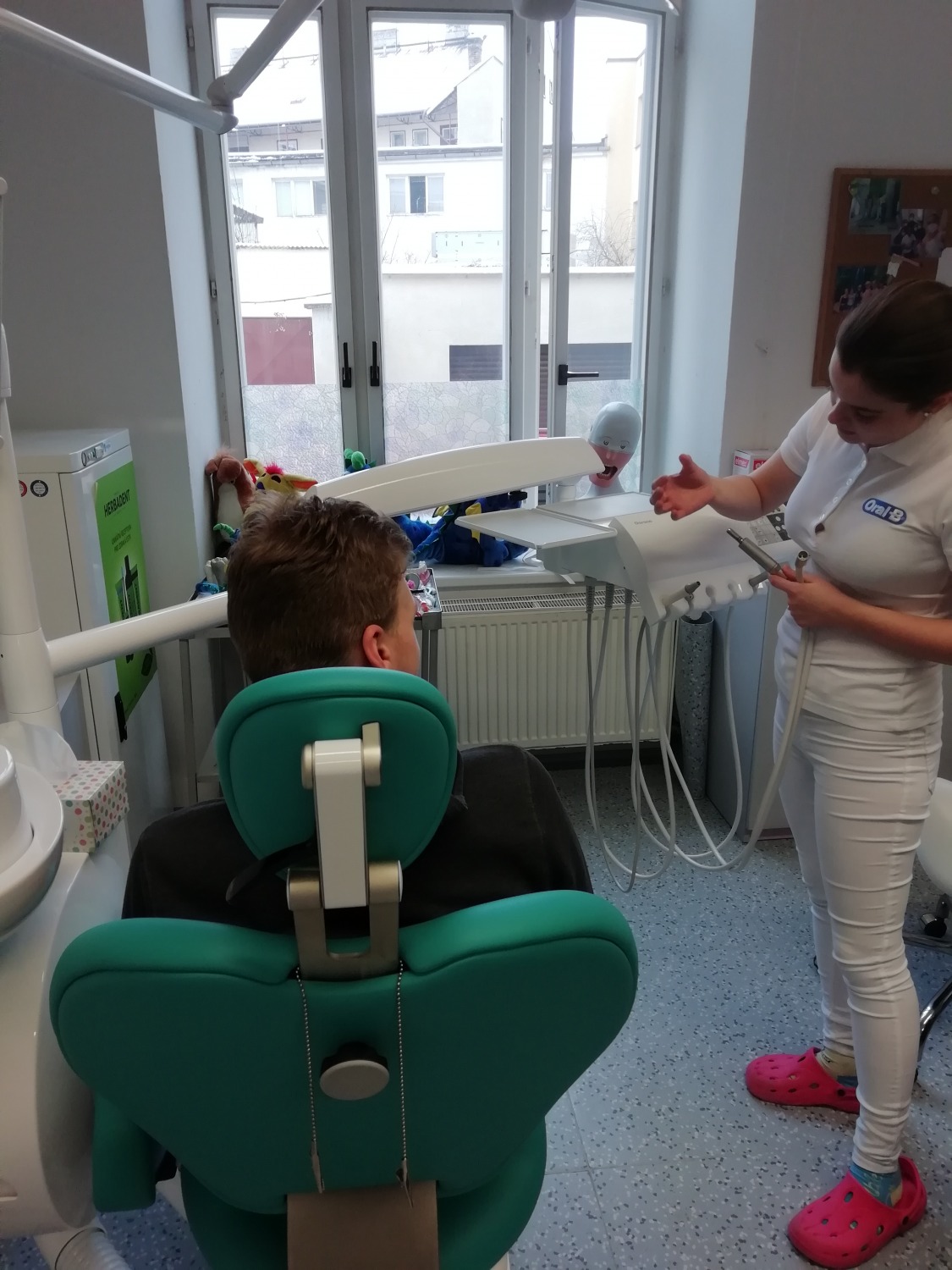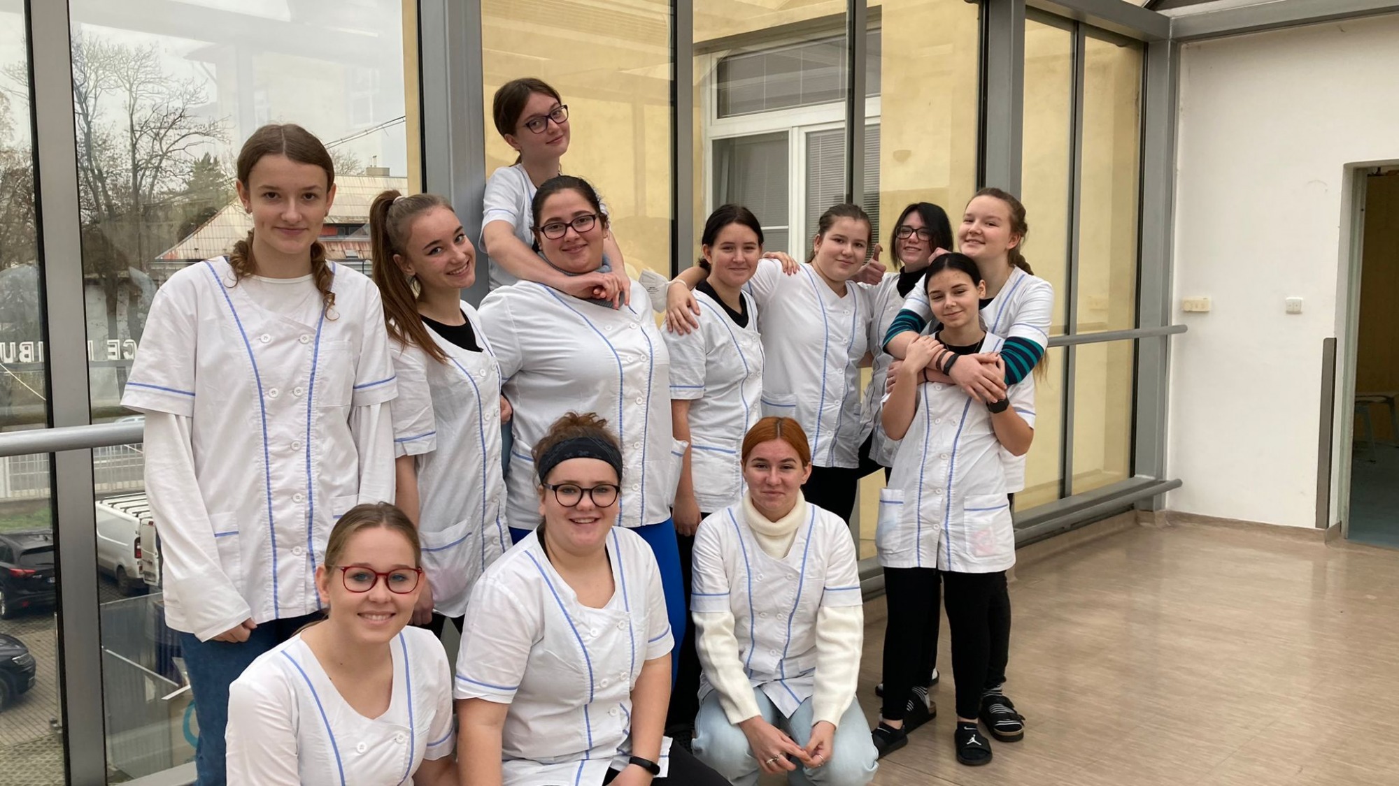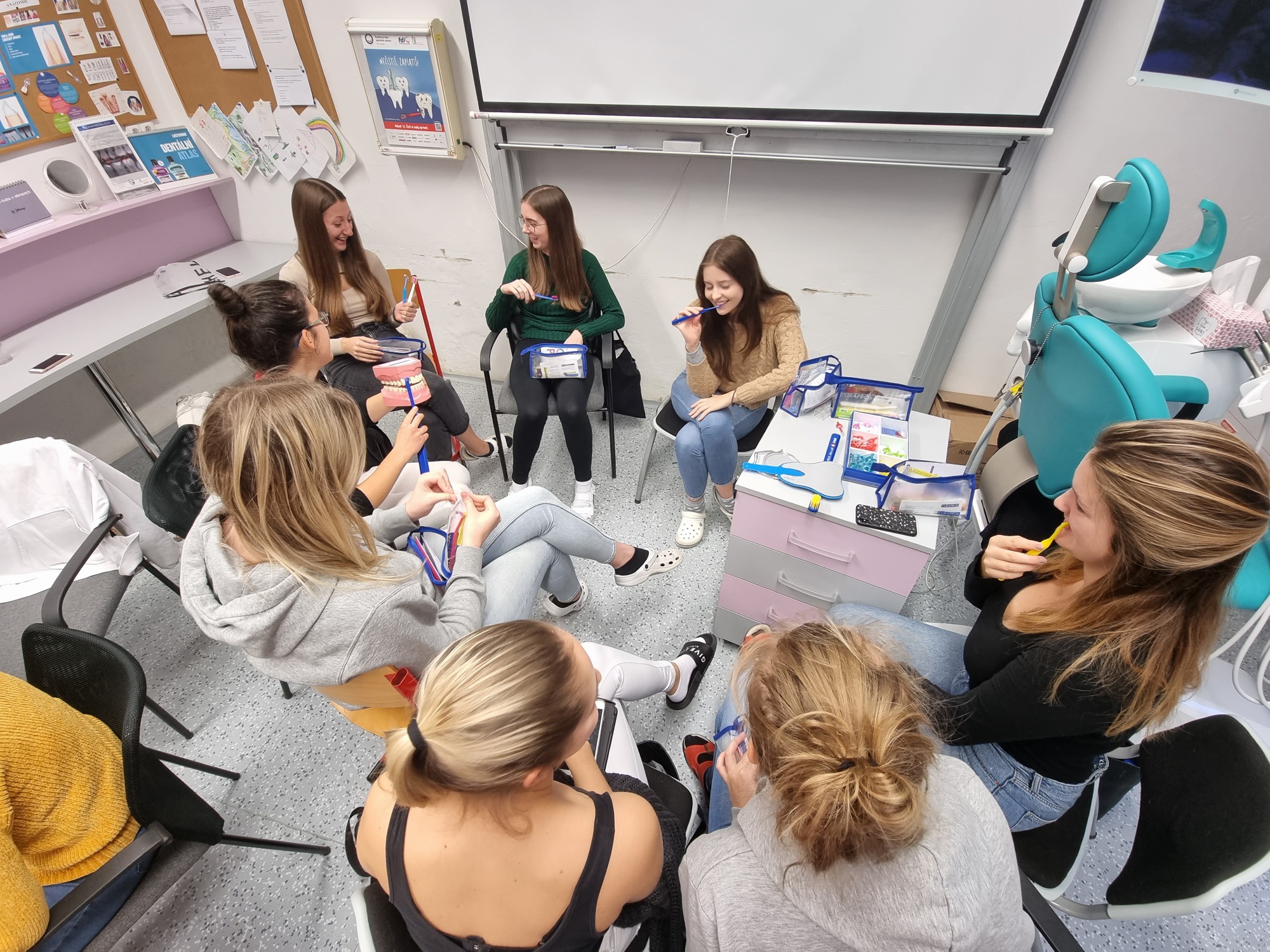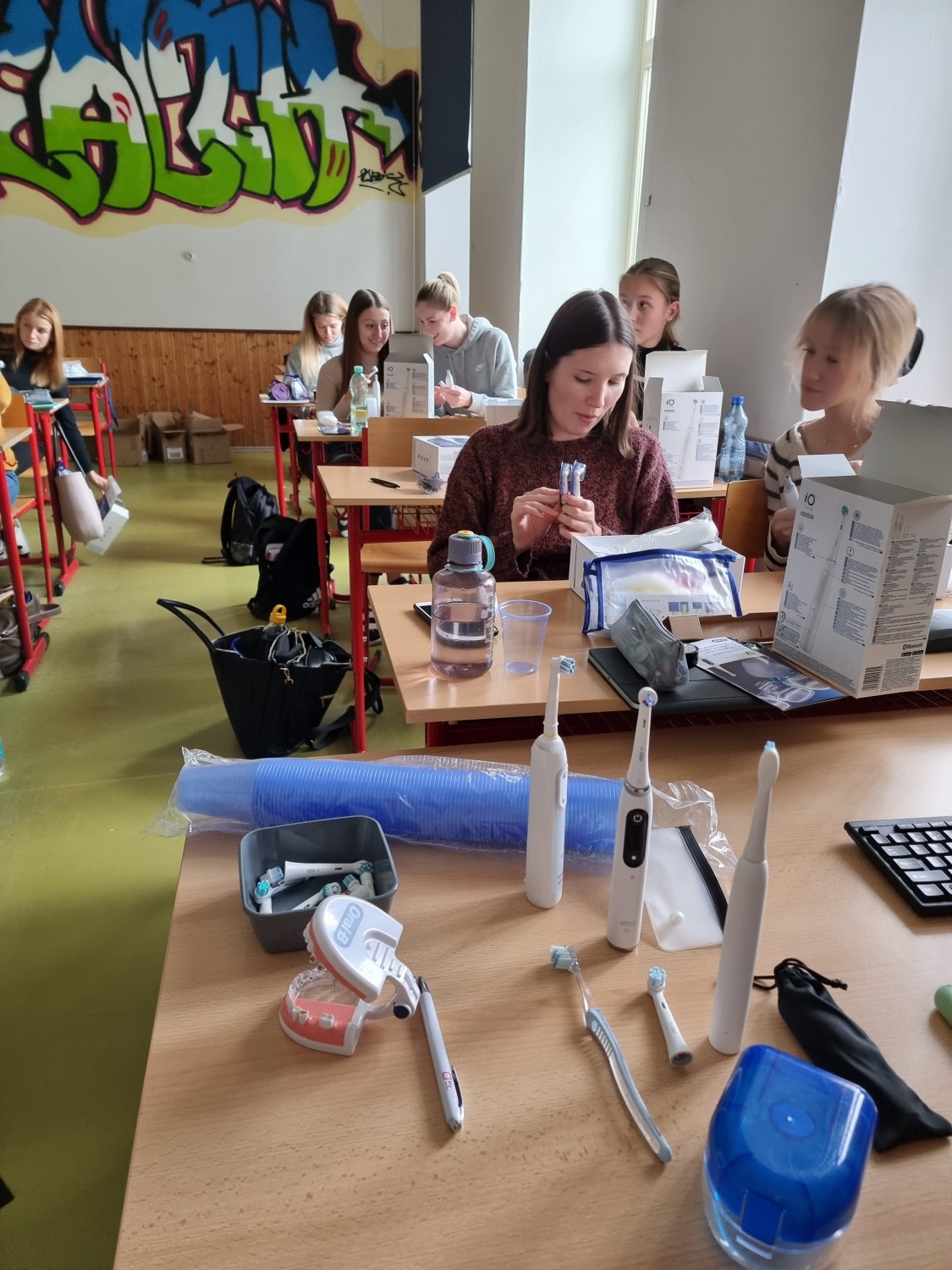 Dne 24. 11. 2022 proběhla u studentek 1.DH prezentace kartáčků pro děti a dospělé, mezizubní péče. Studentky se seznámily se speciálními pomůckami jako například solo kartáček, Hydrosonické kartáčky Curaprox a další. Po seznámení proběhl nácvik technik s kartáčky pod vedením studentek stomatologie. Do školní ordinace jsme obdrželi dar v podobě mezizubních kartáčků, ústní vody a tekutinu na vizualizaci plaku.