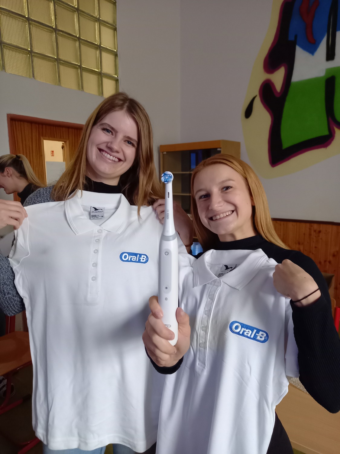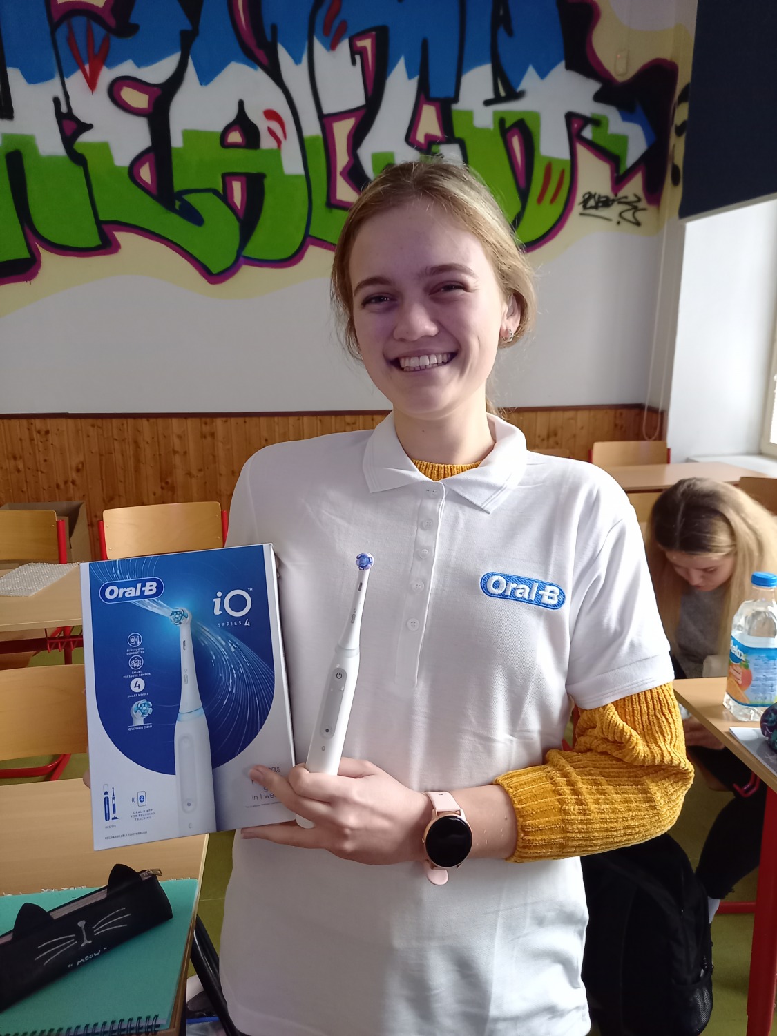 Dne 24. 11. 2022 měly studentky 1.DH velký "čistící" den! Po manuálním čištění s kartáčky od Curaproxu přešly k elektrickým kartáčkům. V teoretickém úvodu se seznámily s jednotlivými druhy elektrických kartáčků . Prakticky si zkusily obarvit povlak v ústech, vyzkoušely si nové kartáčky iO4 na vlastních zubech . Každá studentka získala zajímavé informace a domu si odnesla dárek od firmy- elektrický kartáček a tričko. Firmě patří naše velké poděkování!!!
