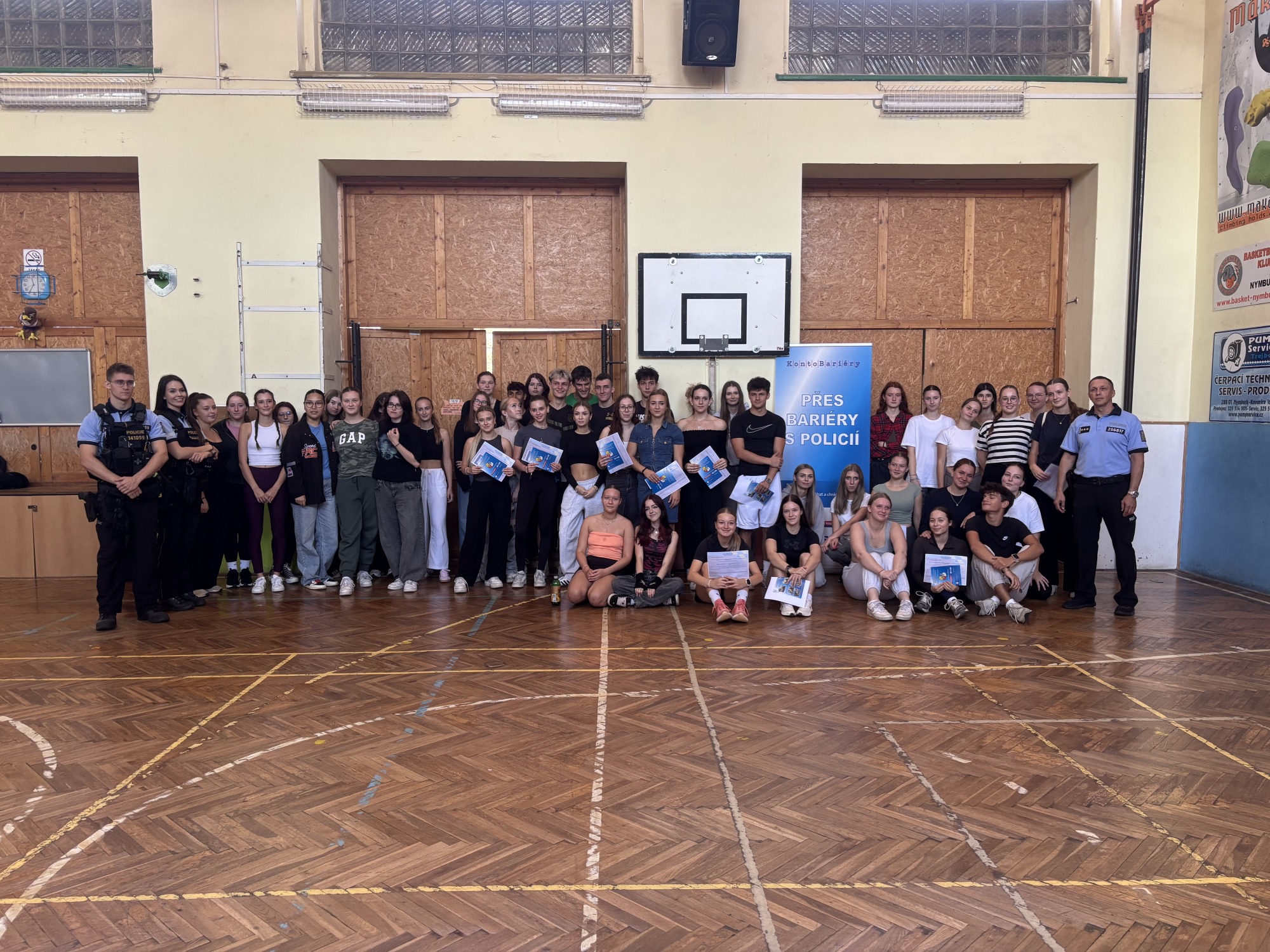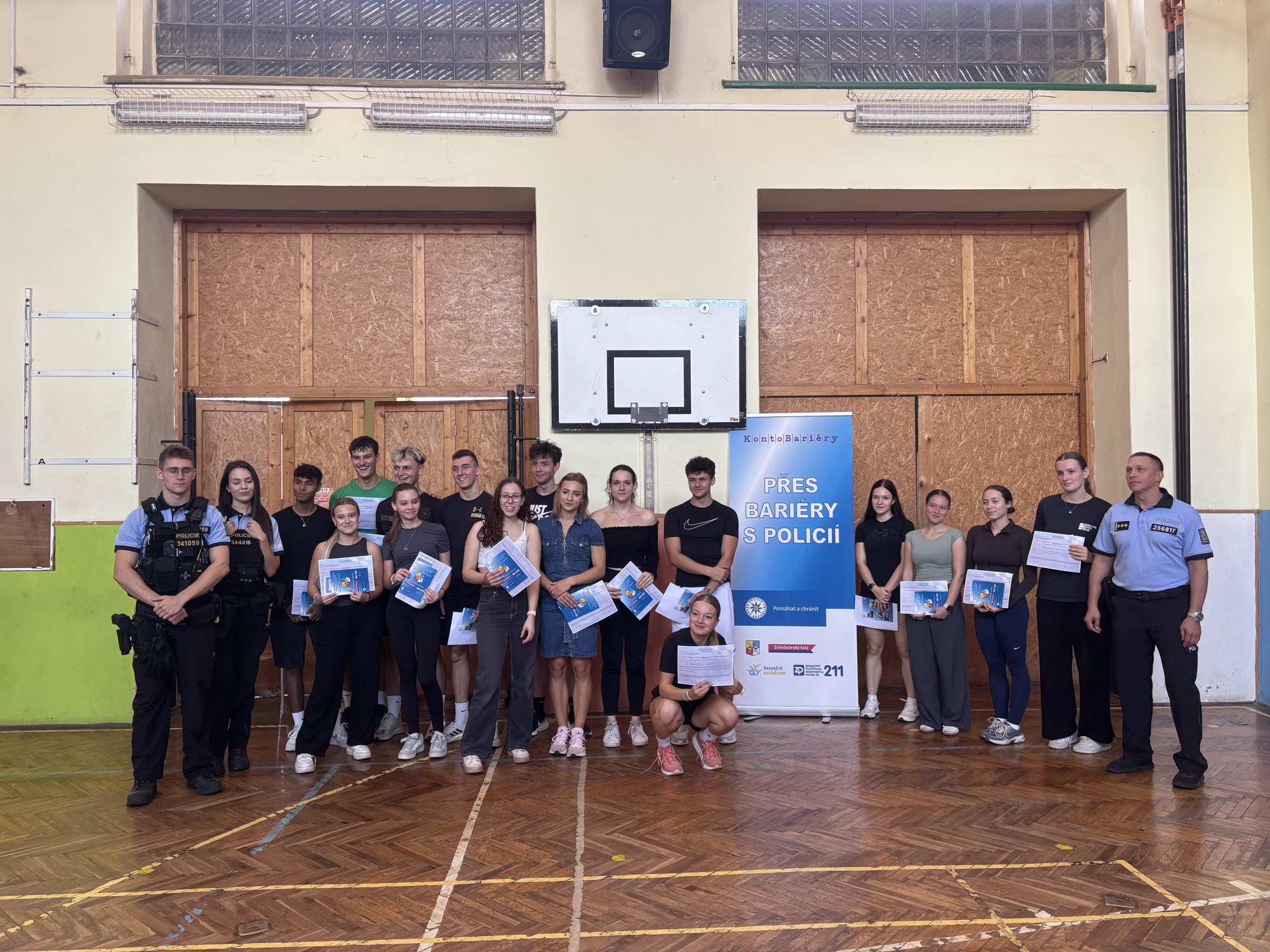 V pátek 19. 9. 2025 se, již tradičně, všichni žáci maturitních ročníků zúčastnili projektu Přes bariéry s policií. Cílem každého žáka bylo absolvovat 4 kondiční testy a získat tím finanční příspěvek pro postiženou slečnu/ vrstevnici. Zároveň 16 žáků splnilo limity kondičních testů a obdrželi certifikáty od České policie.